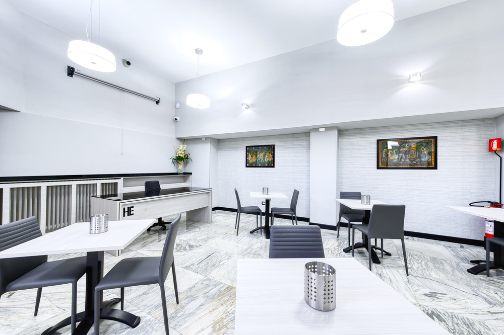 La sala colazioni si completa con il MOBILE BUFFET, nuovi tavoli e le nuove moderne sedute in ecopelle, diventando all’occorrenza una SALA MEETING. I soffitti sono stati ristrutturati interamente, semplificati dal punto di vista estetico e arricchiti di punti luce a creare uno spazio suggestivo. Le pareti sono decorate con una CARTA DA PARATI lavorata a mano di una tonalità elegante e motivi geometrici originali.